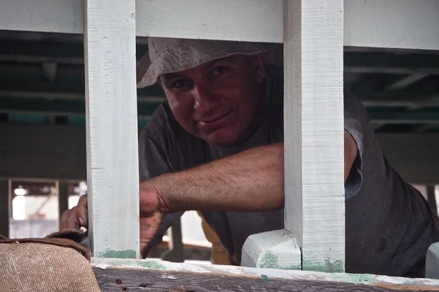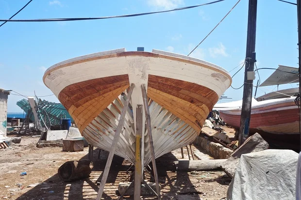 "All my life, since I was a boy, I've been building boats here," he says. Poking a tanned face through the ribbed skeleton of a nearby boat, his nephew Mohammed Bahlowan laughingly says Farouk came out of the womb making boats, gesturing up towards a line of simple white-painted homes where both men live.