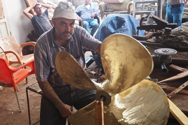 ARWAD, Syria - Outside a battered workshop calf-deep in wood-shavings, Farouk Bahlowan shapes a brass ship propeller, leaning close into the angle grinder to make the smallest adjustments.
