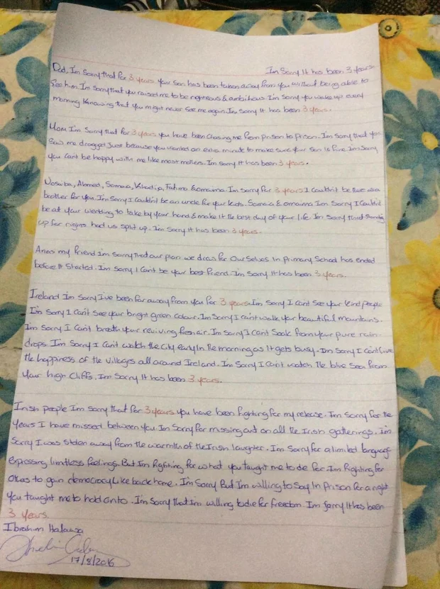One of the letters Ibrahim Halawa has written from prison (Photo courtesy of the Halawa family)
