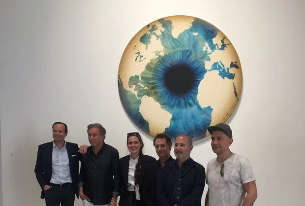 Stephane Custot with artists Bernar Venet, Fabienne Verdier, Pablo Reinoso, Jedd Novatt and Marc Quinn in front of Marc Quinns The Eye of History - Desert Perspective (MEE/Laura Egerton)