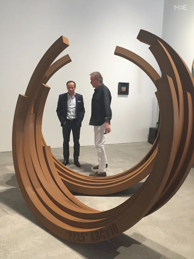 Stephane Custot in conversation with Bernar Venet beside Venet's sculpture 223.5-Ü Arc x 10, 2014 (MEE/Laura Egerton)
