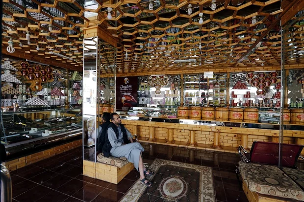 A customer is waiting for his honey in a shop in Yemen (MEE/Mohamed Hamoud)