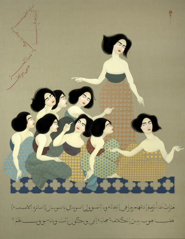 In The Translator, for example, the white skin and delicate features of the women clearly align with the idealised representation of women in Italian Renaissance paintings, while the flatness of the work and composition of the women draw clear parallels to Persian and Iraqi illuminated manuscripts.