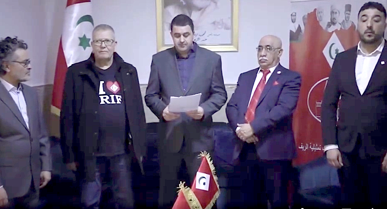 Dans une vidéo publiée samedi sur les réseaux sociaux, on voit le représentant du hirak du Rif, Jaber El Ghadioui, dans les locaux du nouveau bureau, en compagnie d’autres militants du PNR, entonnant l’hymne du Rif, devant le drapeau de la République du Rif (autoproclamée et non reconnue internationalement, établie dans les montagnes du Rif entre 1921 et 1923).