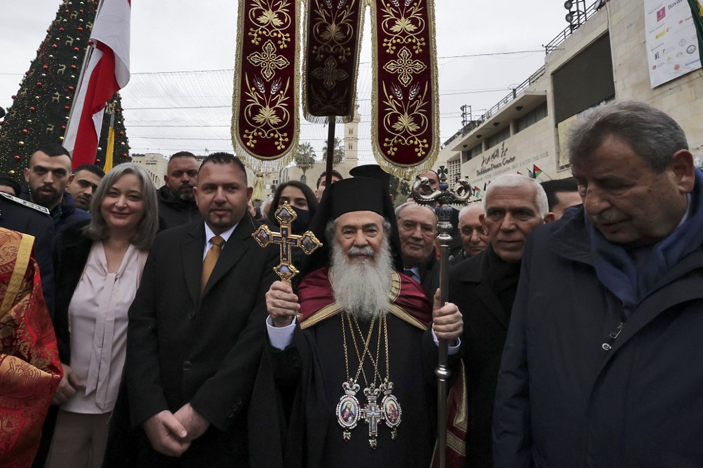 Le patriarche grec orthodoxe de Jérusalem Théophile III arrive à l’église de la Nativité à Bethléem le 6 janvier 2023 (AFP)