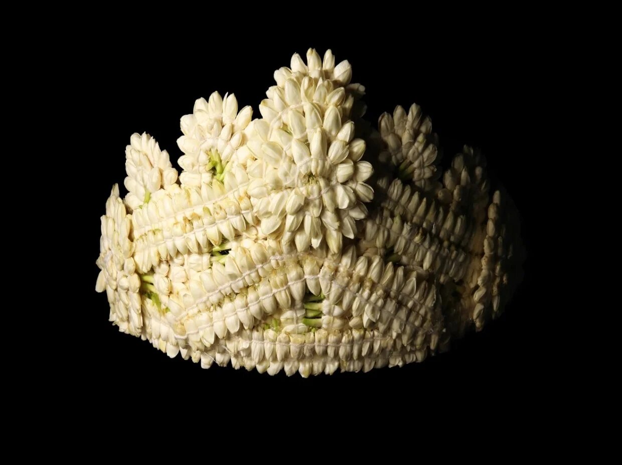 « On entre dans un genre de sensualité. C’est un parfum de tous les jours, d’accueil parfois, c’est un parfum qui parle, qui a de l’âme », décrit-il. (Photo : Reem al-Nasser, Full rassas, Arabian jasmine bullets, Jizan, Arabie saoudite, 2023, boutons de jasmin, installation reproduite pour l’exposition, 40 x 66 cm, Jeddah, Athr gallery, © Courtesy of the Artist and ATHR)