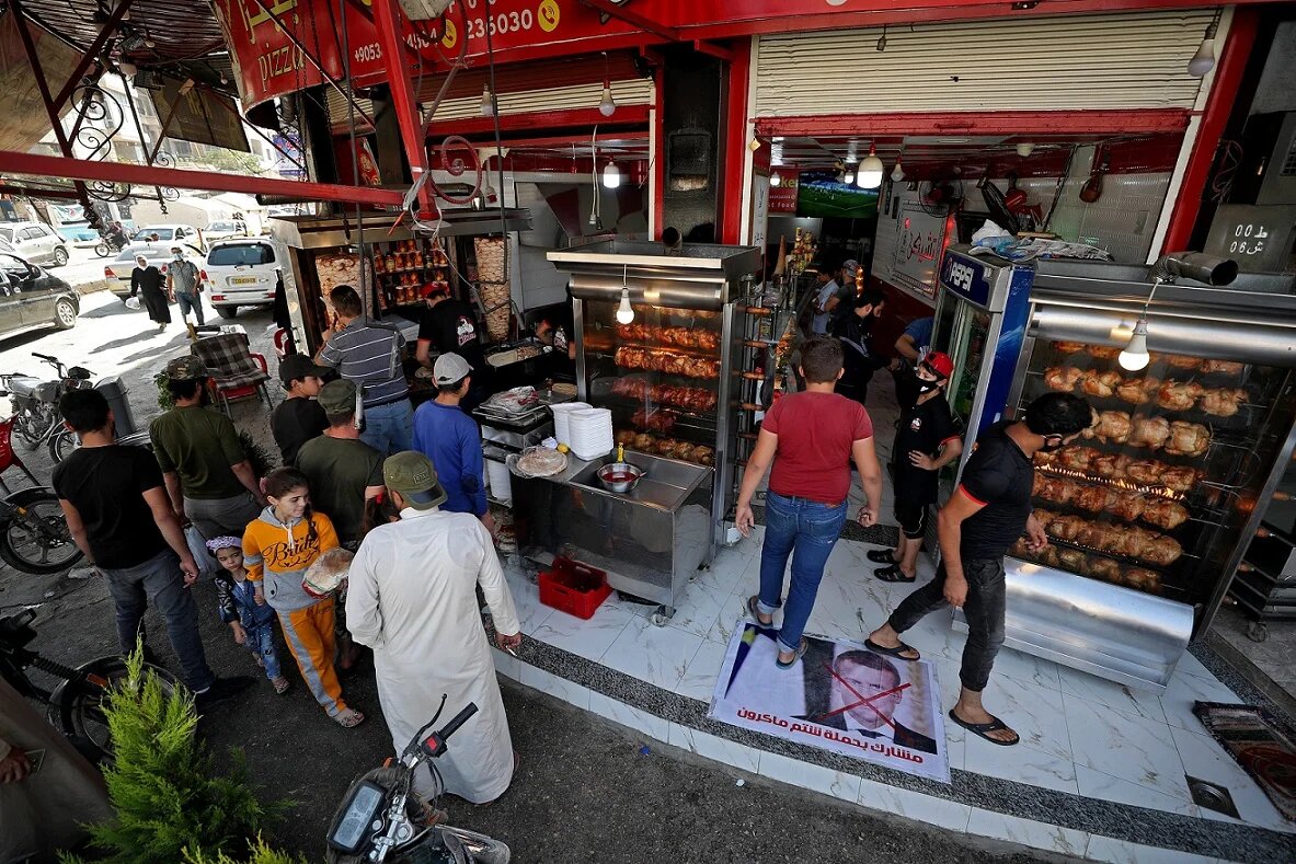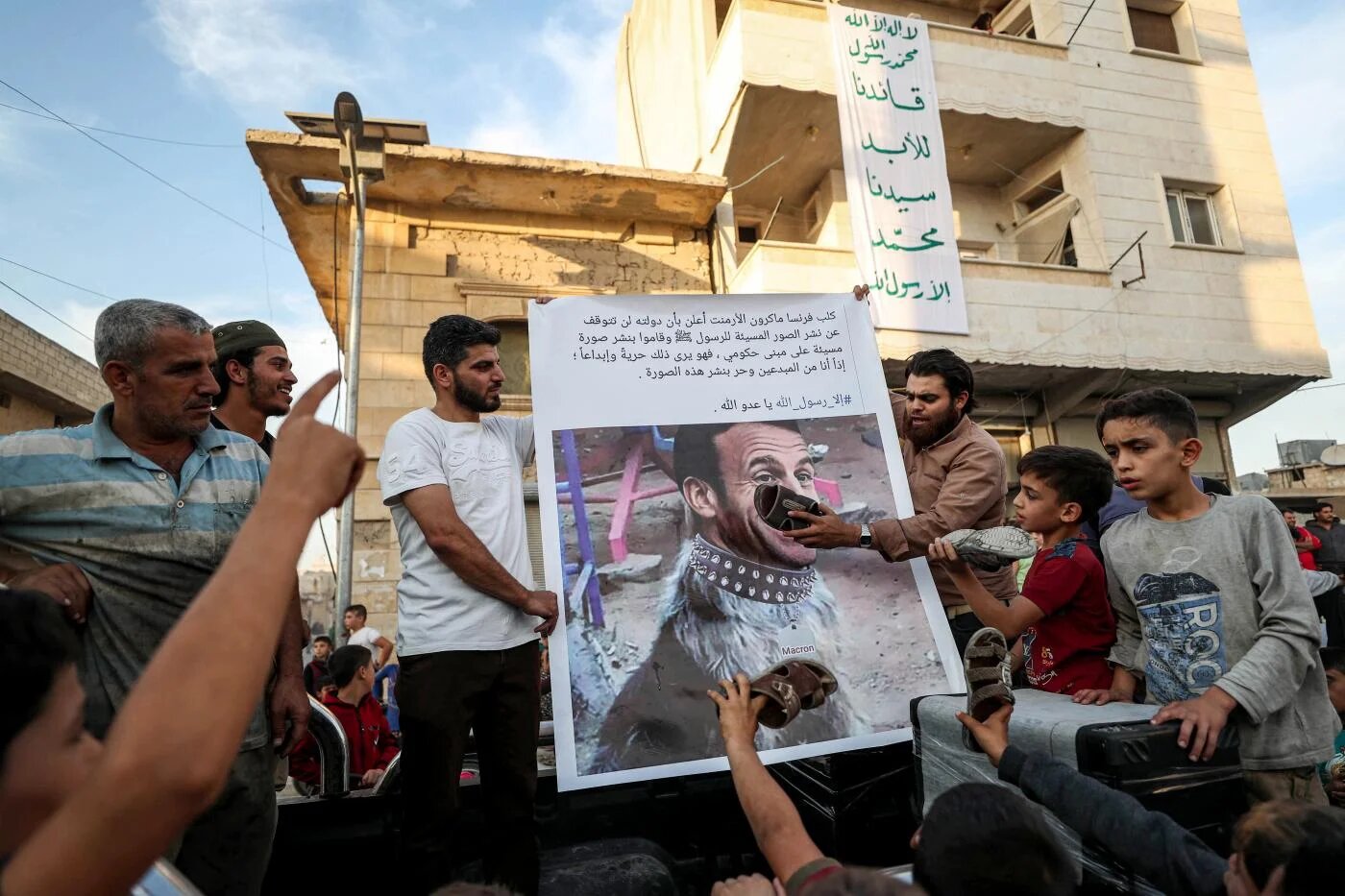 Dans le gouvernorat syrien d’Idleb, une image barrée de Macron a été placée à l’entrée d’un restaurant de street-food, piétinée par les dizaines de personnes qui entrent et sortent (Omar Haj Kadour/AFP).