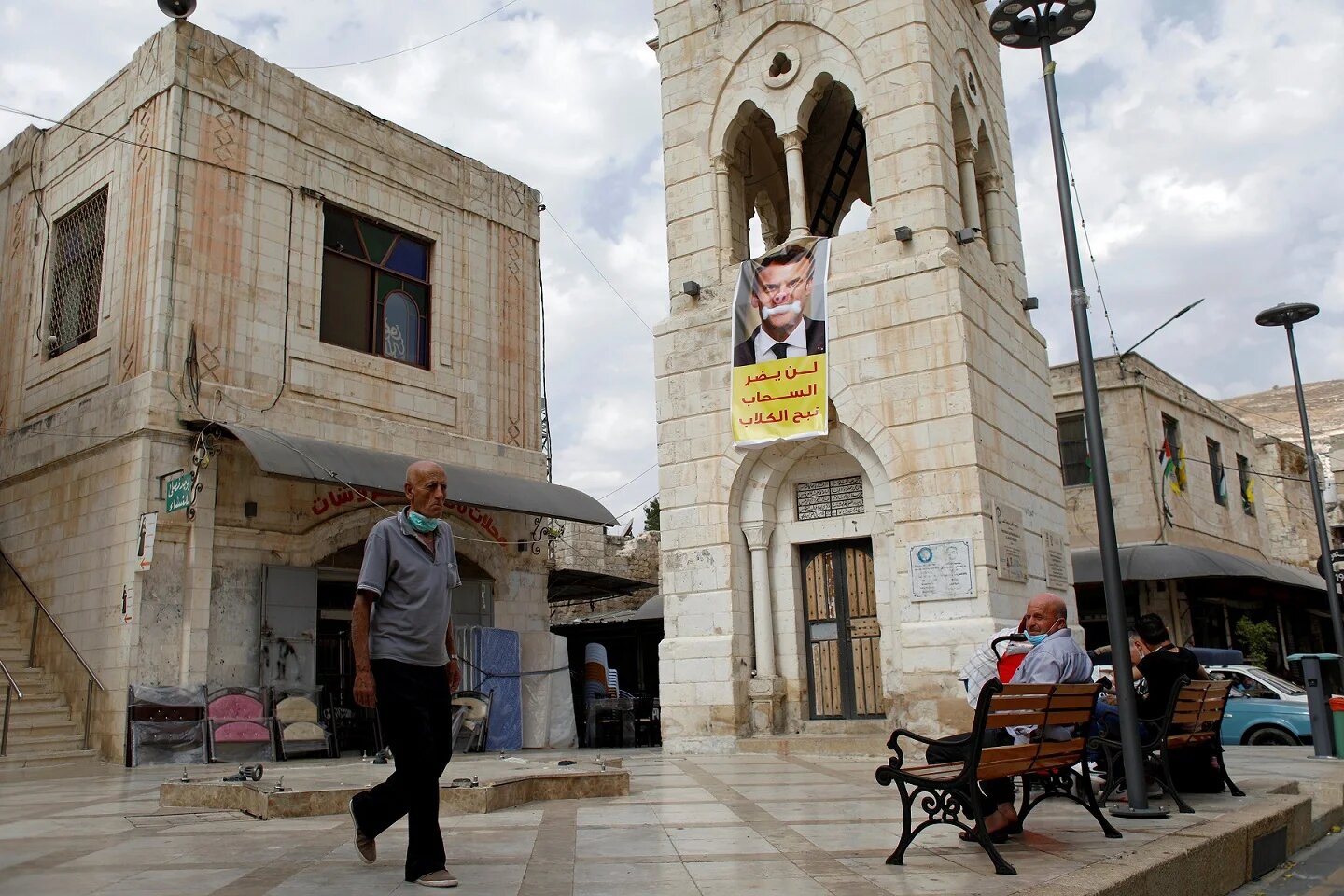 Ailleurs en Palestine, une caricature de Macron, le représentant en chien avec en légende « les nuages ne sont pas blessés par les aboiements des chiens », a été accrochée sur un bâtiment de la ville de Naplouse en Cisjordanie occupée (Mohamad Torokman/Reuters).