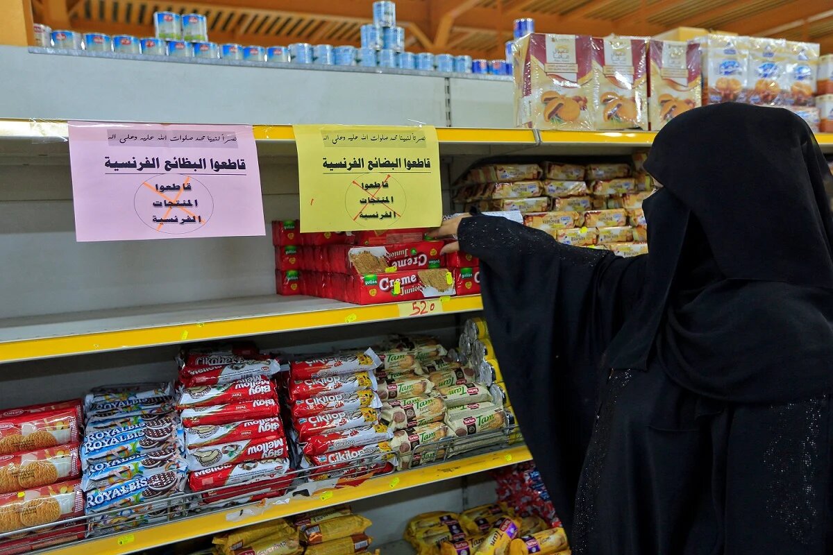 Dans la capitale jordanienne, Amman, on a pu voir plusieurs supermarchés retirer les produits français de leurs rayons, tandis que les appels au boycott se multiplient dans le monde arabe et au-delà (Khalil Mazwari/AFP).