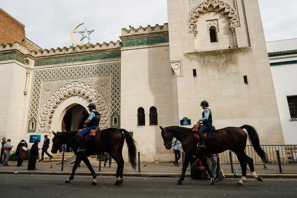 La police montée patrouille devant la Grande Mosquée de Paris lors de la prière du vendredi midi à Paris le 13 octobre 2023, alors que le recteur Chems-Eddine Hafiz doit prononcer un sermon sur la situation au Proche-Orient (AFP/Dimitar Dilkoff)