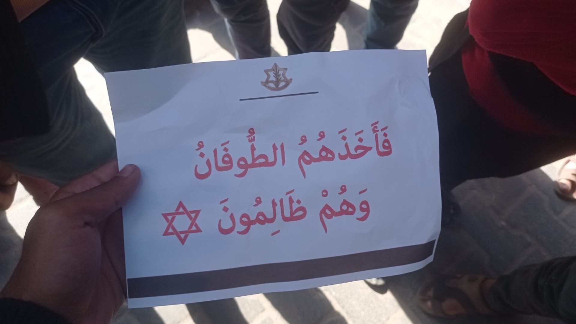 Le texte, qui apparaît à côté d’une étoile de David et du logo de l’armée israélienne, fait référence à l’histoire du prophète Nuh, connu sous le nom de Noé dans la Bible. Dans les deux textes sacrés, Dieu punit les transgresseurs par un déluge qui emporte le monde entier.
