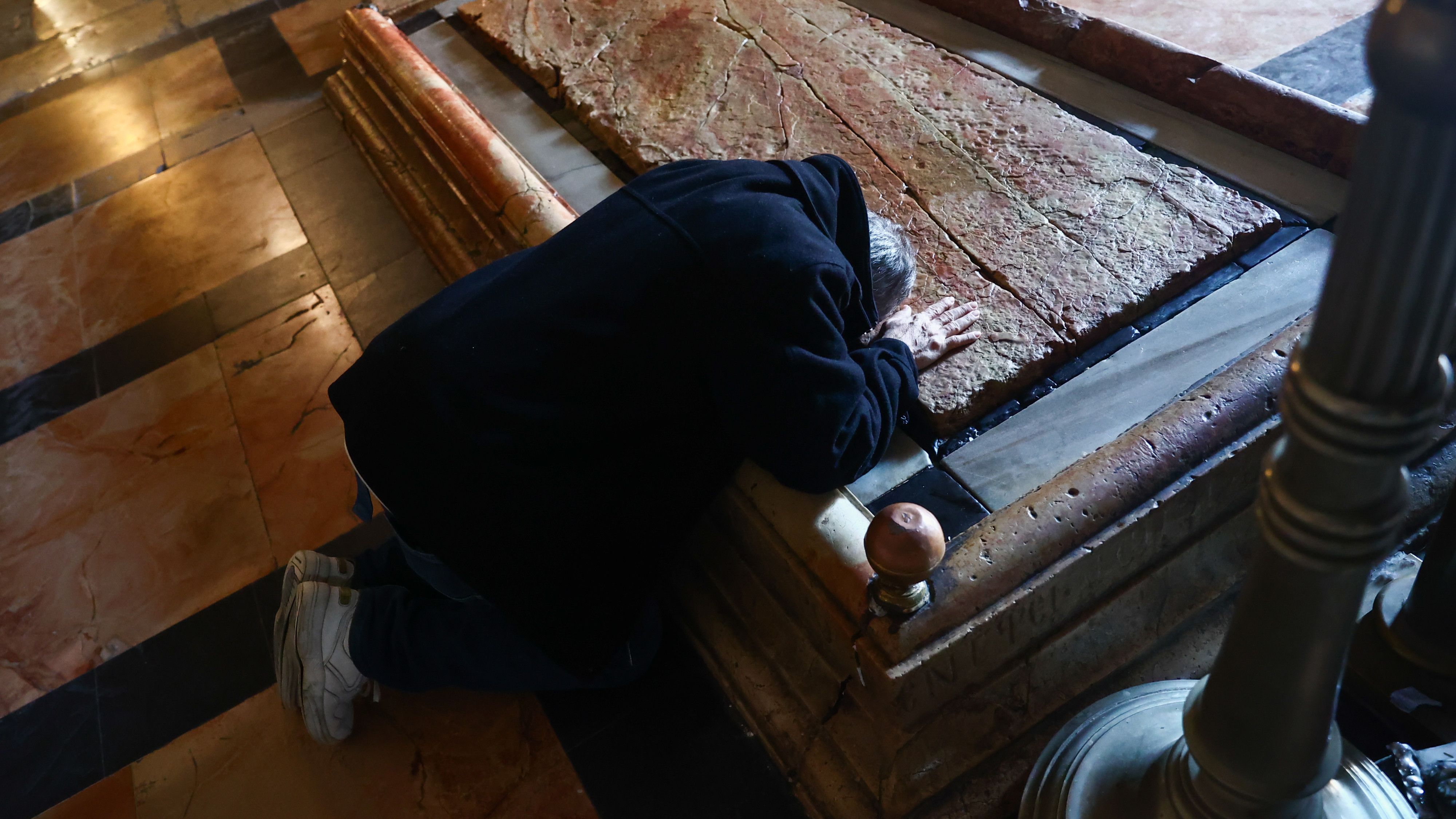 Un homme touche la Pierre de l’onction dans l’église du Saint-Sépulcre à Jérusalem, le 29 décembre 2022 (Reuters)
