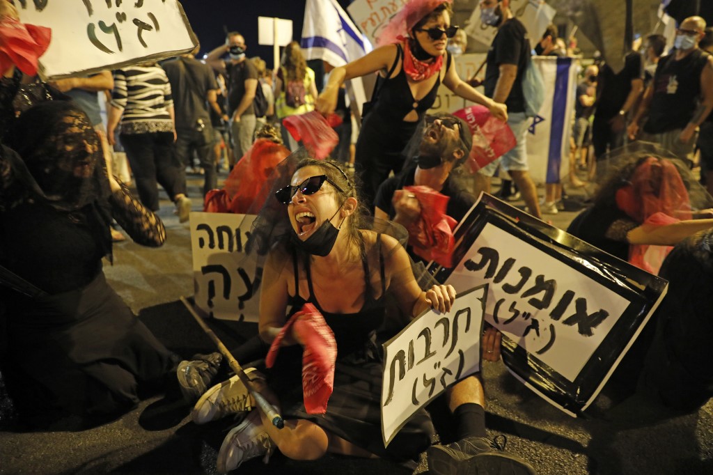 Au départ, ils étaient quelques dizaines puis quelques centaines, tous les samedis soirs, postés sur les ronds-points et ponts des autoroutes, partout dans le pays, avec des drapeaux noirs pour protester contre l’accord de gouvernement entre Benyamin Netanyahou et son rival, l’ancien chef de l’armée Benny Gantz, qui avait pourtant fait campagne contre le Premier ministre.