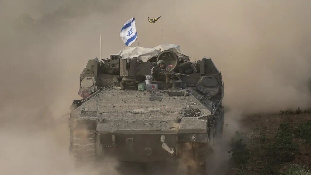 Un soldat israélien à bord d’un véhicule blindé de transport de troupes quittant la bande de Gaza, le 26 février 2024 (AFP)