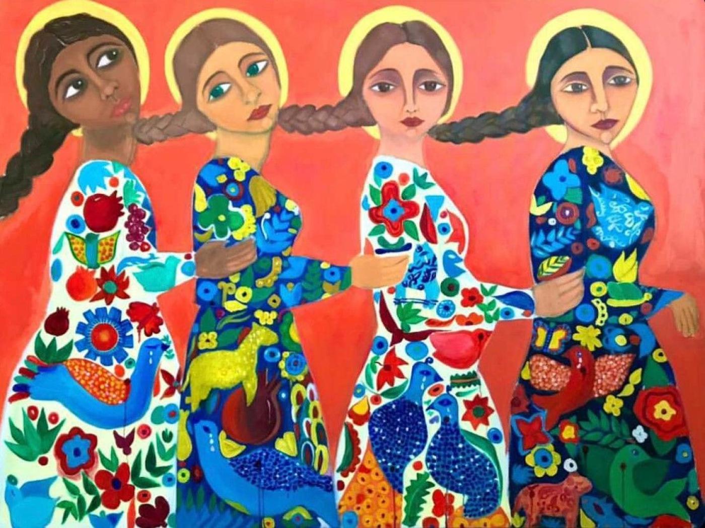Les femmes représentées sur ce tableau ont la tête inclinée. « Quand on se tient droit, debout, cela montre qu’on est stable, alors qu’une tête inclinée évoque un sentiment d’abattement, une faiblesse », détaille Malak Mattar. « Nous sommes des êtres humains, nous vivons des guerres, des moments violents… Notre ténacité cède parfois. »