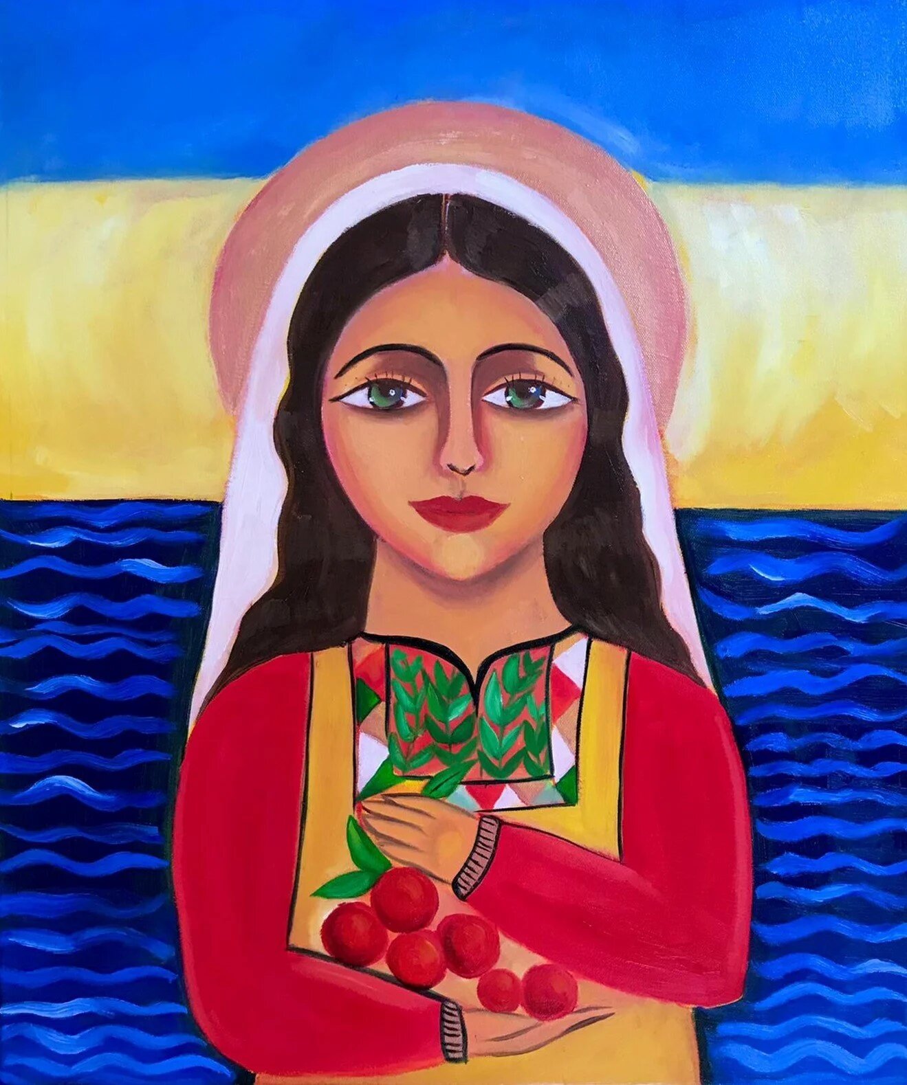 Ses œuvres comportent également des symboles de la Palestine, comme les oranges représentées dans le tableau ci-dessus. « C’est ma façon de me connecter à mon pays », affirme-t-elle, ajoutant que des olives, des grenades, des oiseaux et d’autres animaux sauvages apparaissent également dans ses tableaux. « Nous devons vivre dans la beauté ; il n’y en avait pas dans la bande de Gaza, alors j’ai créé ma propre réalité. »