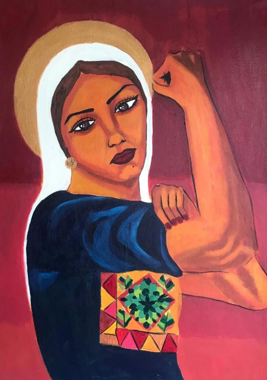 Les auréoles sont inspirées d’un voyage scolaire au cours duquel elle a accompagné sa mère à l’église catholique romaine de la Sainte-Famille de Gaza. Malak Mattar confie qu’elle a été surprise par les représentations sur le plafond de l’église et explique que l’auréole qu’elle ajoute à ses personnages leur confère une force et un pouvoir spirituels. Elle aimerait un jour créer un espace dédié aux femmes, en particulier aux artistes, qui sont selon elle toujours obligées de s’autocensurer. « L’autocensure est une maladie, le contraire de la créativité. La liberté est tellement importante pour l’expression. »