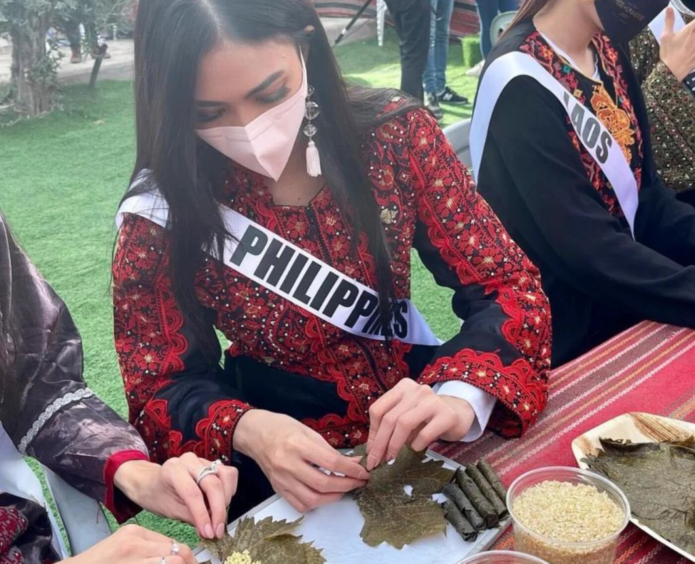 Dans la série de photos publiée par Beatrice Gomez, Miss Philippines, qui affirme découvrir la culture israélienne, les candidates à l’élection de Miss Univers, vêtues d’une thobe (robe) traditionnelle palestinienne, roulent des feuilles de vigne dans la ville d’Eilat, au bord la mer Rouge.
