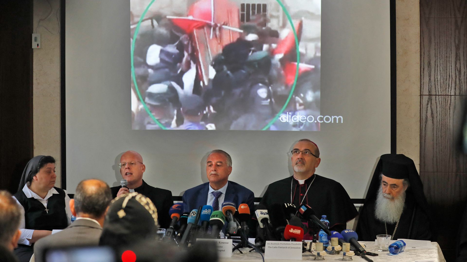 Lors d’une conférence de presse à Jérusalem, des responsables chrétiens présentent les vidéos filmées dans l’hôpital Saint-Joseph avant le cortège funéraire de la journaliste d’Al Jazeera Shireen Abu Akleh, le 16 mai 2022 (AFP)