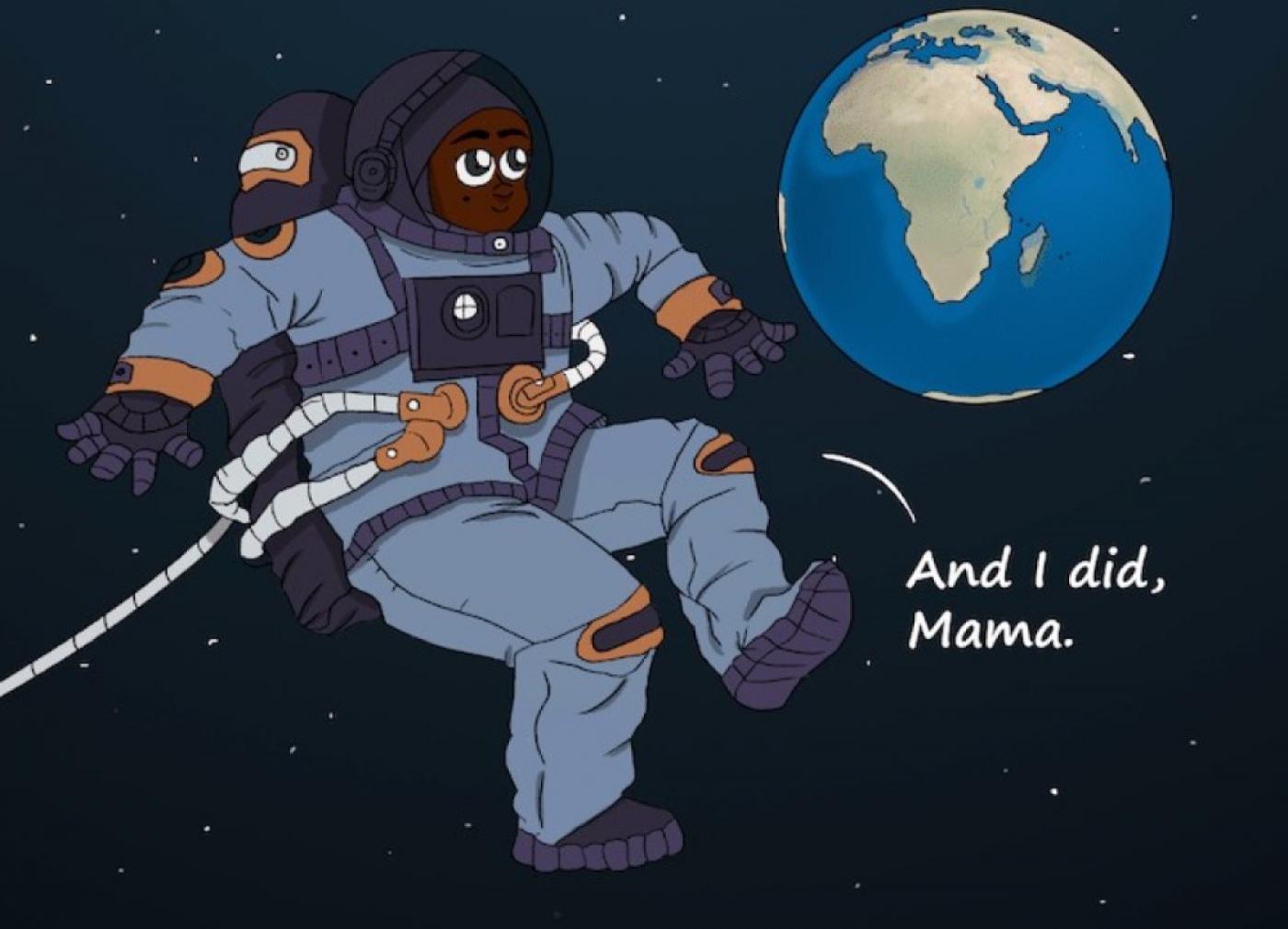 Plus loin dans la bande dessinée, sur une autre illustration, Kawkab flotte dans l’espace, le regard exalté, après avoir réalisé ses rêves avec les encouragements et le soutien de sa mère.