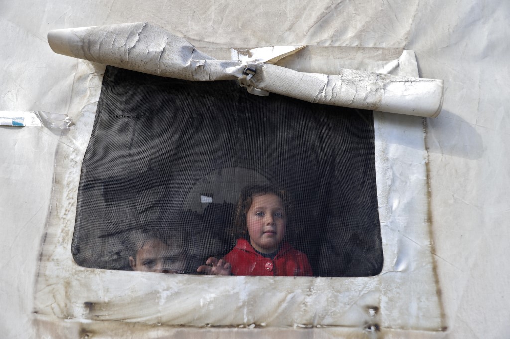 Des petits Syriens regardent par la fenêtre d’une fenêtre de tente, dans un abri d’urgence, au nord de la province d’Idleb, tenue par les rebelles, un jour après les séismes qui ont frappé la Turquie et la Syrie (AFP/Abdulaziz Ketaz)