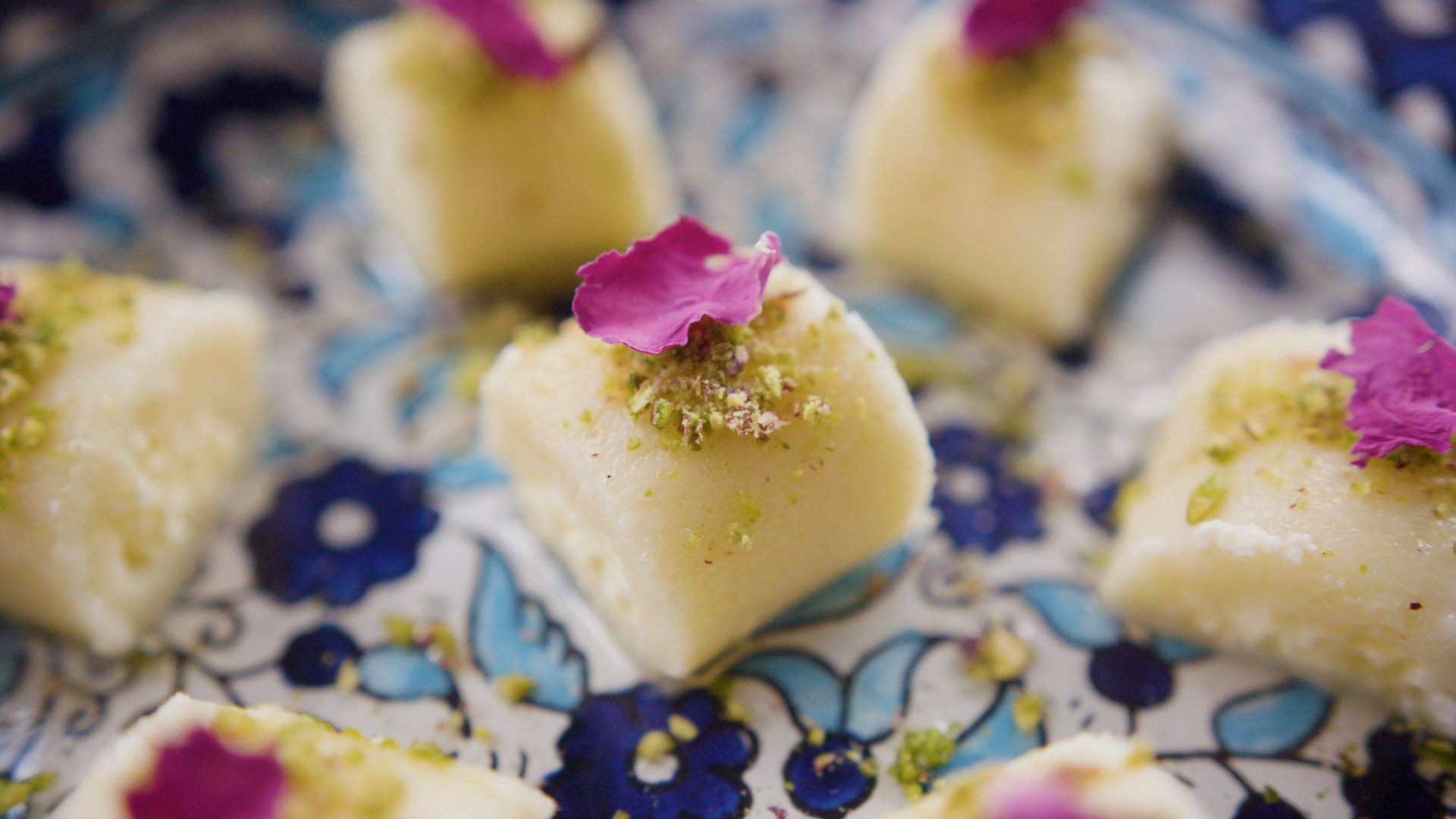 - Disposez les rouleaux sur un plateau de service, saupoudrez chacun d’un peu de pistache moulue au centre et de pétales de rose séchés.