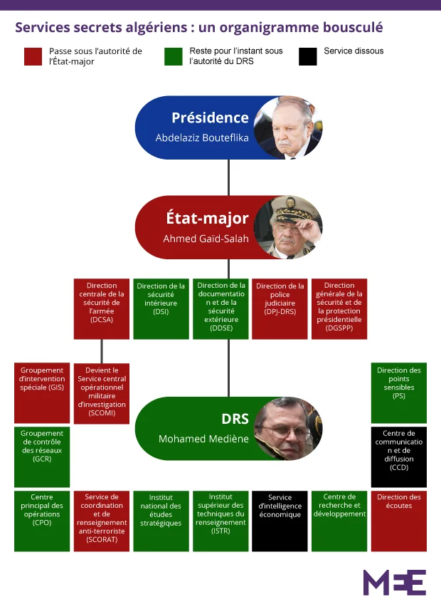 Le premier département à changer de tutelle a été, en 2013, le Centre de communication et de diffusion du DRS, chargé de la surveillance des médias. Bouteflika le soupçonnait d’avoir fait filtrer des informations sur son incapacité à gouverner à cause de sa maladie, qui lui avait valu une longue hospitalisation à Paris (presque 80 jours) en 2013.