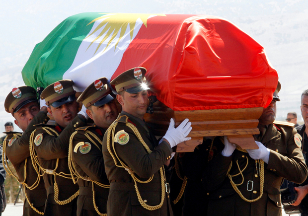 Photo : funérailles de Jalal Tabani le 6 octobre 2017 à Souleimaniye. Le choix de draper son cercueil du drapeau kurde et non irakien, sur fond de tensions liées au référendum sur le Kurdistan irakien tenu quelques jours plus tôt, a suscité la controverse (Reuters).