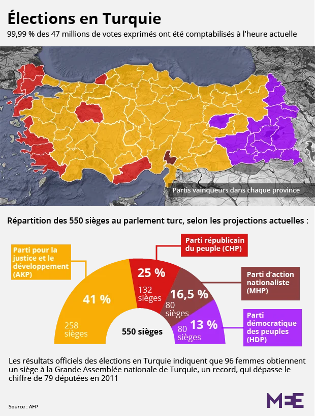 Jusqu’à aujourd’hui, l’AKP avait remporté tous les scrutins (élections présidentielles, législatives et municipales) sans opposition sérieuse depuis sa première arrivée au pouvoir en 2002. Cependant, depuis dimanche, le parti ne détient que 258 des 276 sièges nécessaires pour former une majorité dans le parlement de 550 sièges.