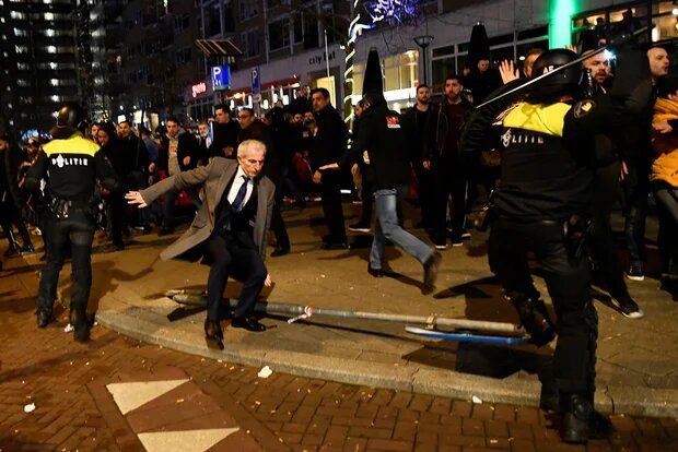 Photo : des officiers de police néerlandais chargent des manifestants turcs à Rotterdam (Reuters).