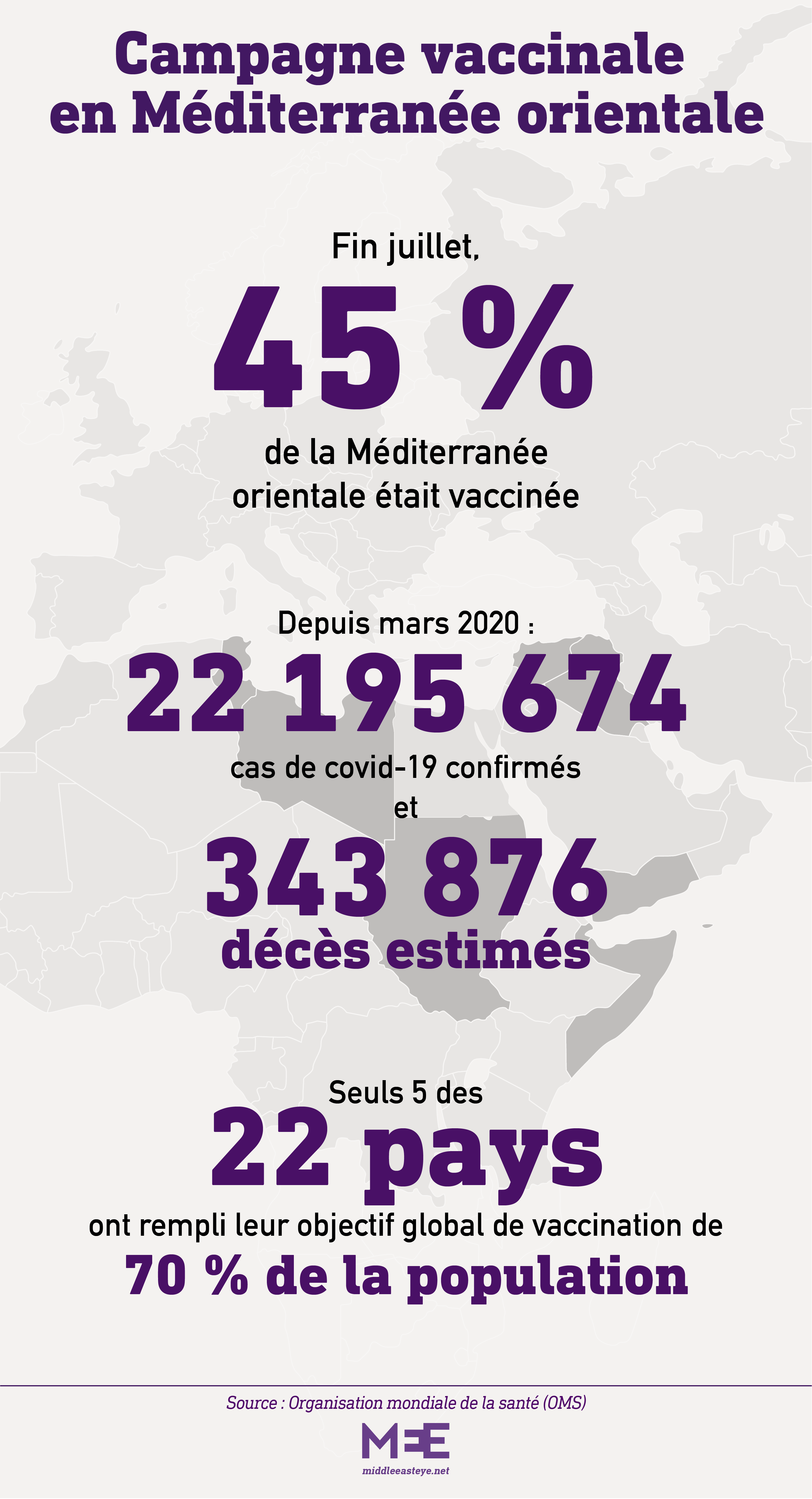 Fin juillet, l’Organisation mondiale de la santé (OMS) a tiré la sonnette d’alarme quant à la multiplication des cas de covid dans la région de la Méditerranée orientale (EMRO), qui s’étend du Maroc au Pakistan mais ne comprend pas Israël et l’Algérie.