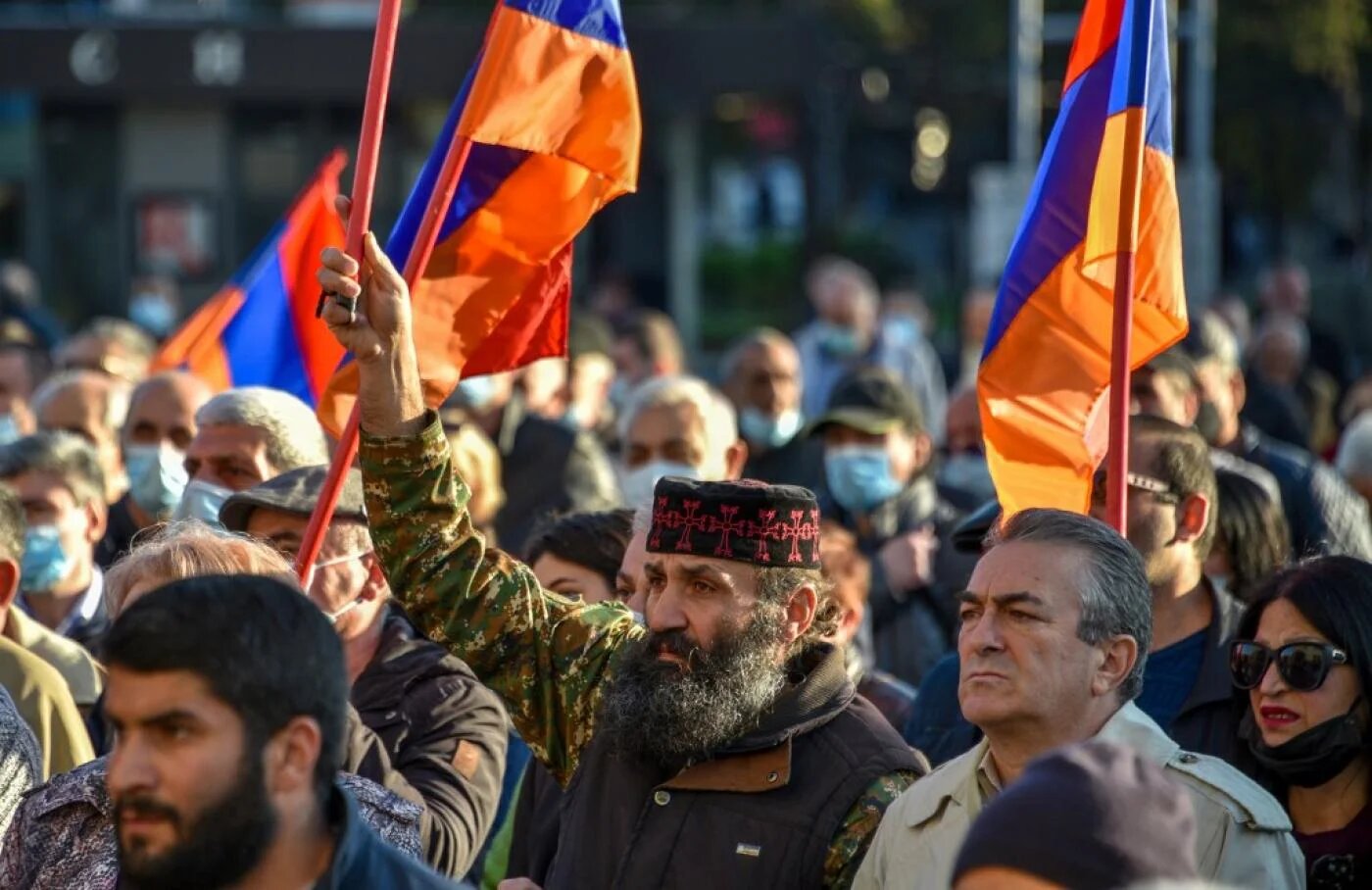 Une enseignante qui nous a abordés nous a fait part de son désespoir face à l’absence de soutien apporté par l’Occident à l’Arménie. Portant un masque de protection dans la foule de manifestants, elle a déclaré avoir assisté à un grand nombre de conférences et de séminaires internationaux célébrant la liberté et la démocratie.