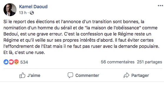 Traduction : « Le président Bouteflika se moque du peuple, ignorant ses revendications et prolonge son mandat au-delà d'avril 2019 »
