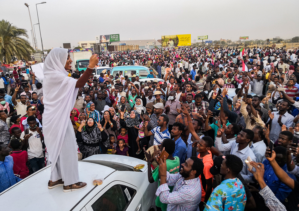 Alaa Salah, militante soudanaise haranguant des foules d’hommes lors des manifestations devant l’état-major militaire soudanais en avril 2019 (AFP)