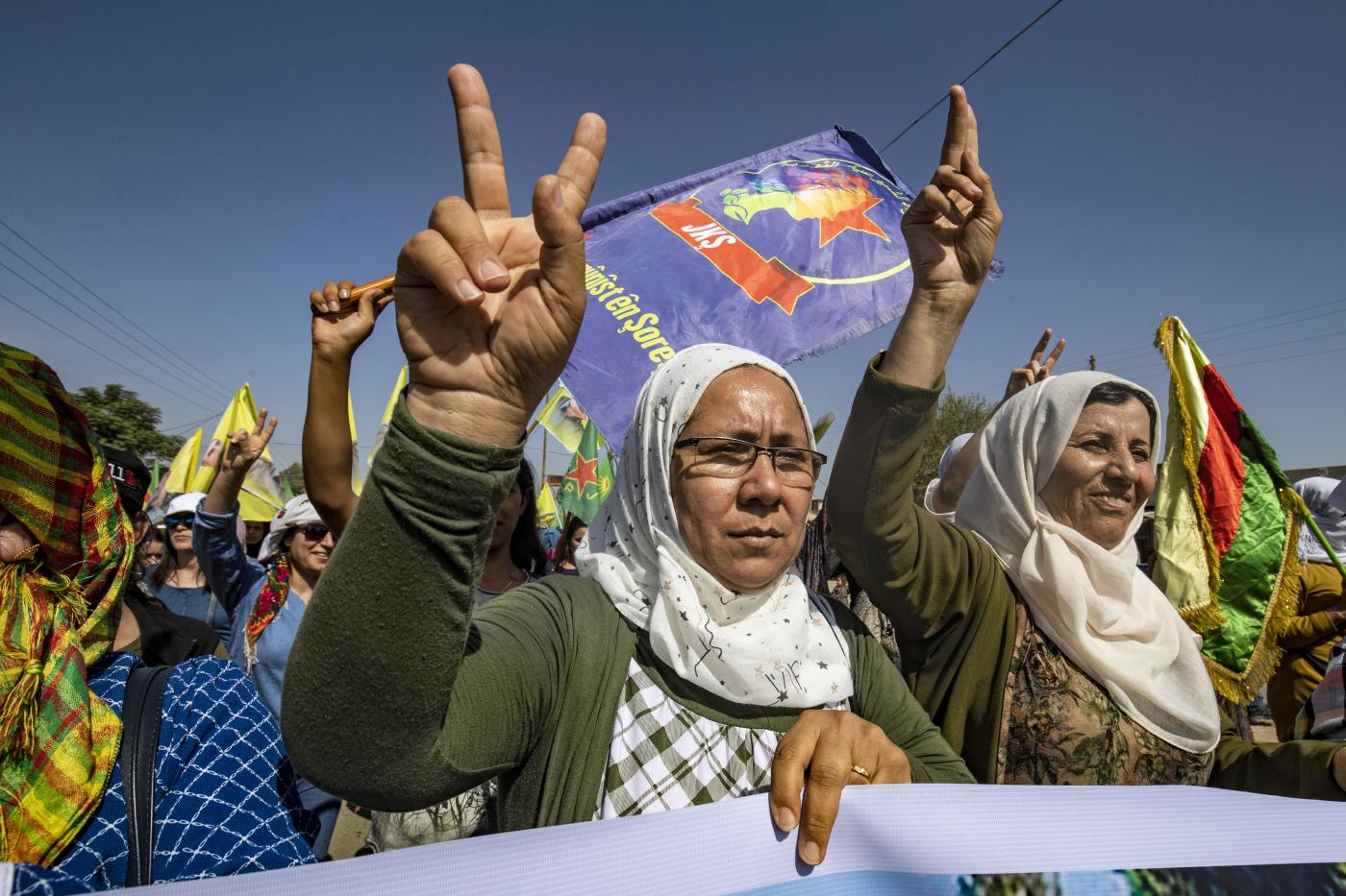 Des Kurdes syriennes font le V de la victoire pendant une manifestation contre les menaces turques dans la ville de Ras al-Aïn, dans le gouvernorat syrien de Hassaké, près de la frontière turque, le 9 octobre (AFP)