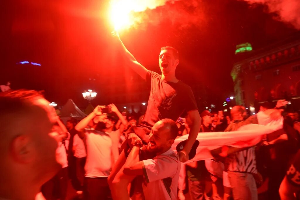 Les drapeaux avaient peut-être servi l’après-midi pour le 22e vendredi de mobilisation contre le pouvoir. Le soir, ils étaient de nouveau dans rue, flottant dans les airs ou entourant les épaules des Algérois descendus par milliers dès le coup de sifflet final.