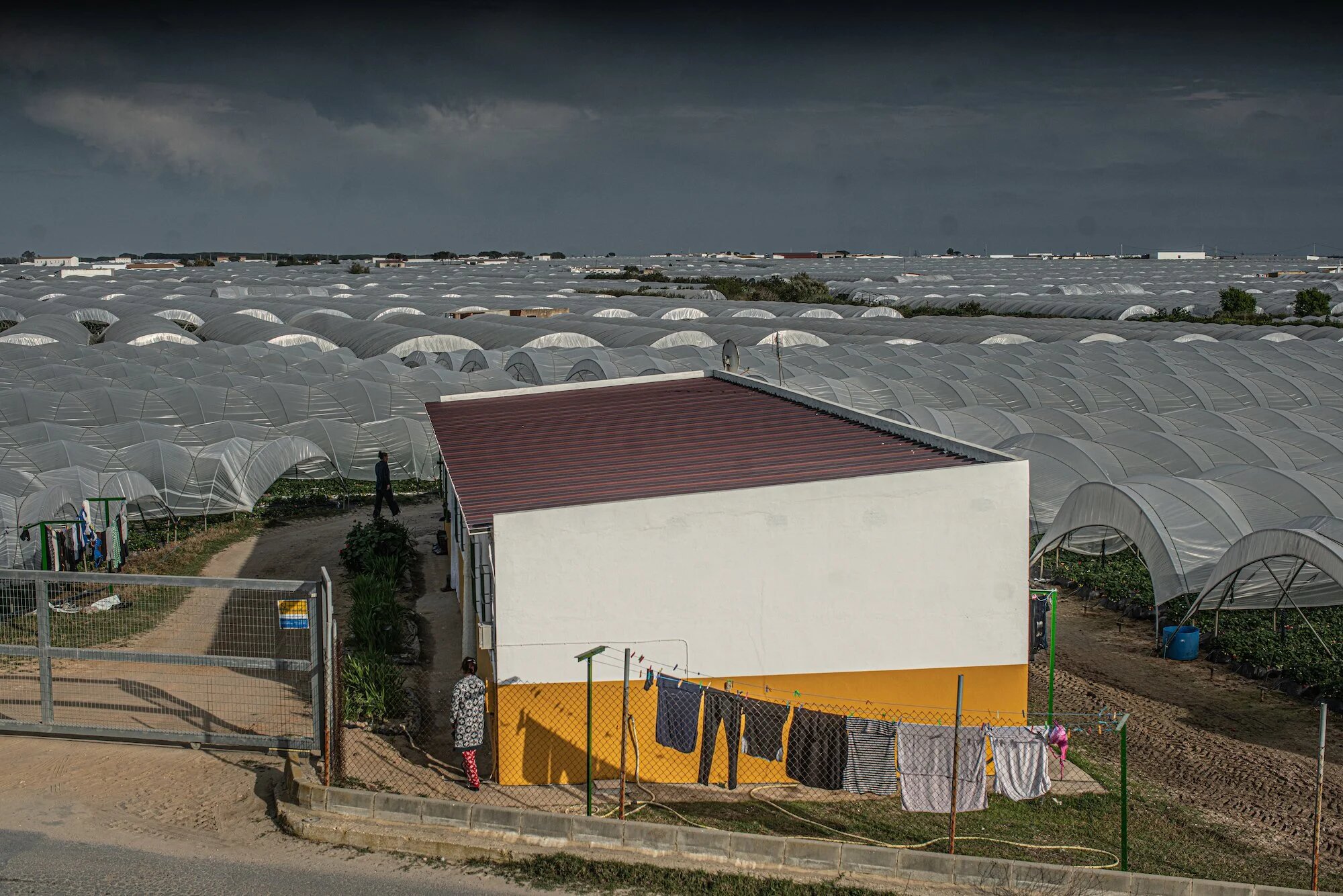 Pendant la récolte, les travailleurs vivent souvent dans des cabanes surpeuplées à la ferme et ont rarement un aperçu de la vie au-delà des champs de fraises. (MEE/Pablo Tosco)