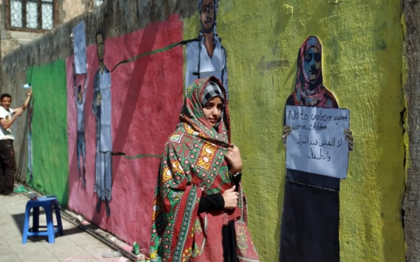 Une Yéménite se tient devant des graffitis portant un message anti-violence sur un mur de la capitale Sanaa le 25 décembre 2014 (AFP)