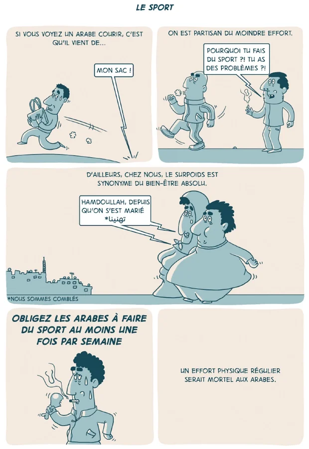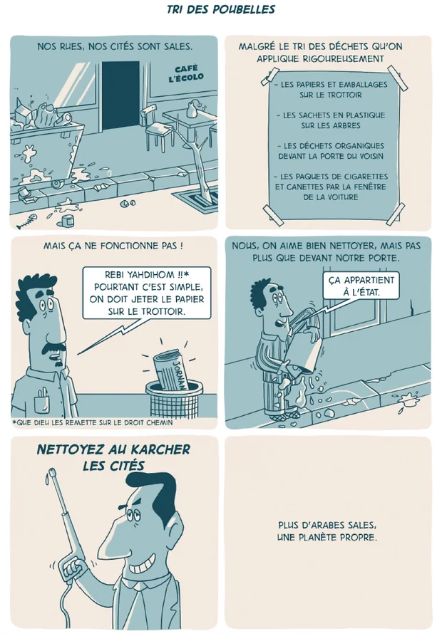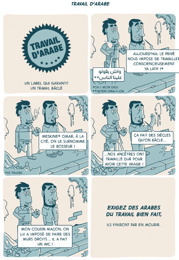 SZ : Mon titre au départ était Comment se débarrasser des Arabes pour un monde meilleur. Le mot « Arabe » est très important. Je l'explique au début. [Salim Zerrouki lit le « Mode d'emploi » qui ouvre la bande dessinée : « Le mot ‘’Arabe’’ fait référence au nom donné par le colon pour désigner les autochtones du Maghreb et non l'‘’Arabe’’ du Moyen-Orient »] Pour moi, on est Maghrébins, pas Arabes. D'ailleurs, quand on se traite d'« Arabes » entre nous, c'est péjoratif.