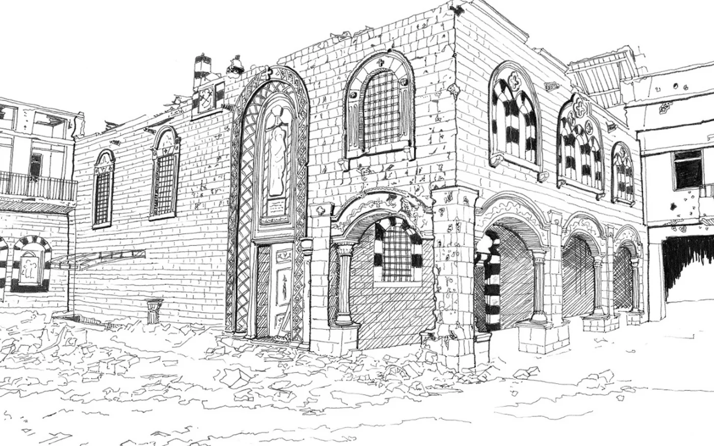 L’église de la Ceinture-de-la-Vierge-Marie, dont l’entrée principale a été endommagée par les combats (dessin de Marwa al-Sabouni)