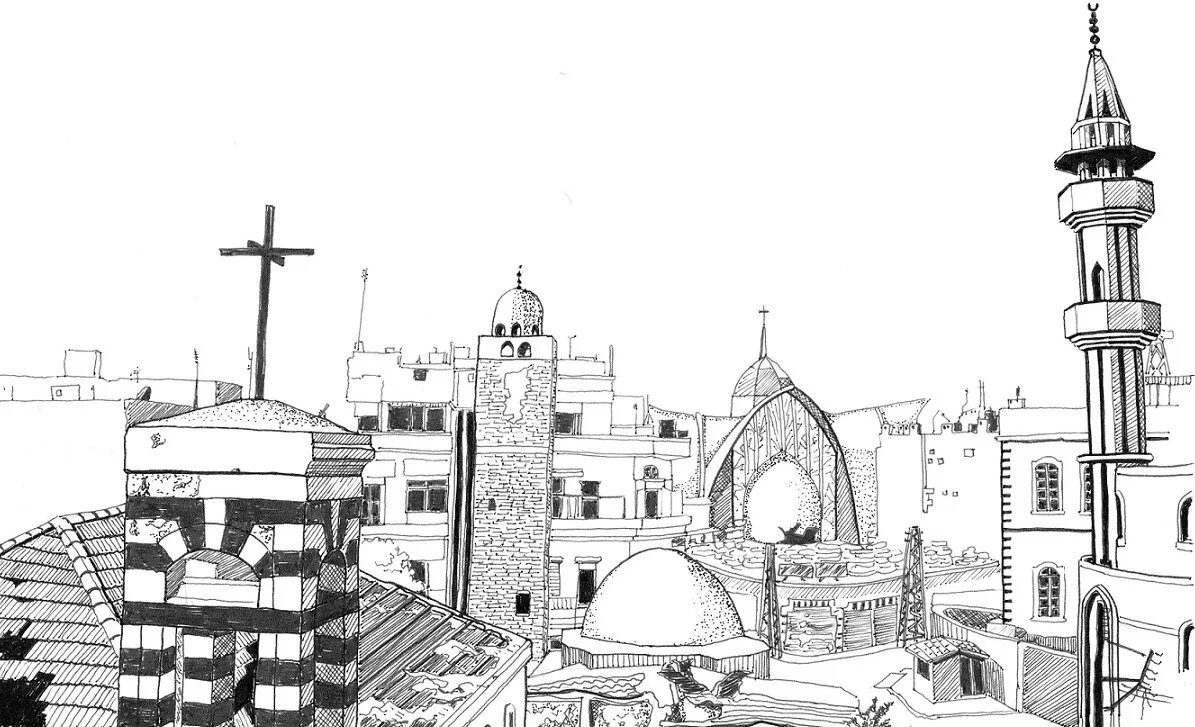 Une zone du quartier d’al-Hamidyah, dans le vieux Homs, communément surnommée « entre les deux minarets ». Au loin, on peut voir la façade arrière endommagée de l’église catholique (dessin de Marwa al-Sabouni)