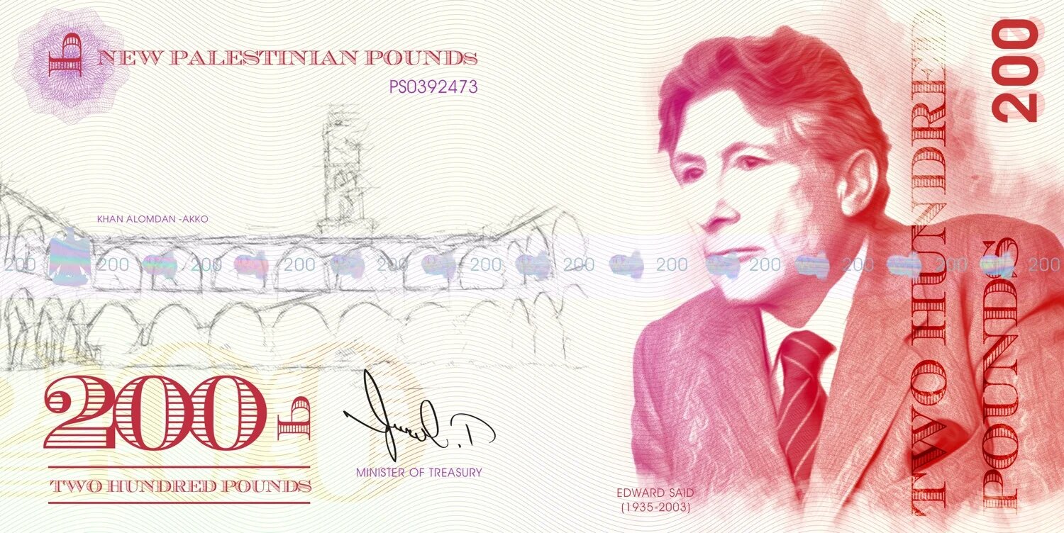 Saif al-Deen Oda, de l’AMP, a également indiqué à MEE que cela ne serait pas possible en raison de l’état de l’économie palestinienne. « Israël n’accepterait pas l’idée de laisser les Palestiniens imprimer leur propre monnaie », a-t-il affirmé. « Cela fait partie de l’occupation. » Ci-dessus, l’universitaire Edward Saïd apparaît sur le verso du billet de 200 livres, à côté de Khan al-Umdan dans la ville d’Akko (également connue sous le nom d’Acre).