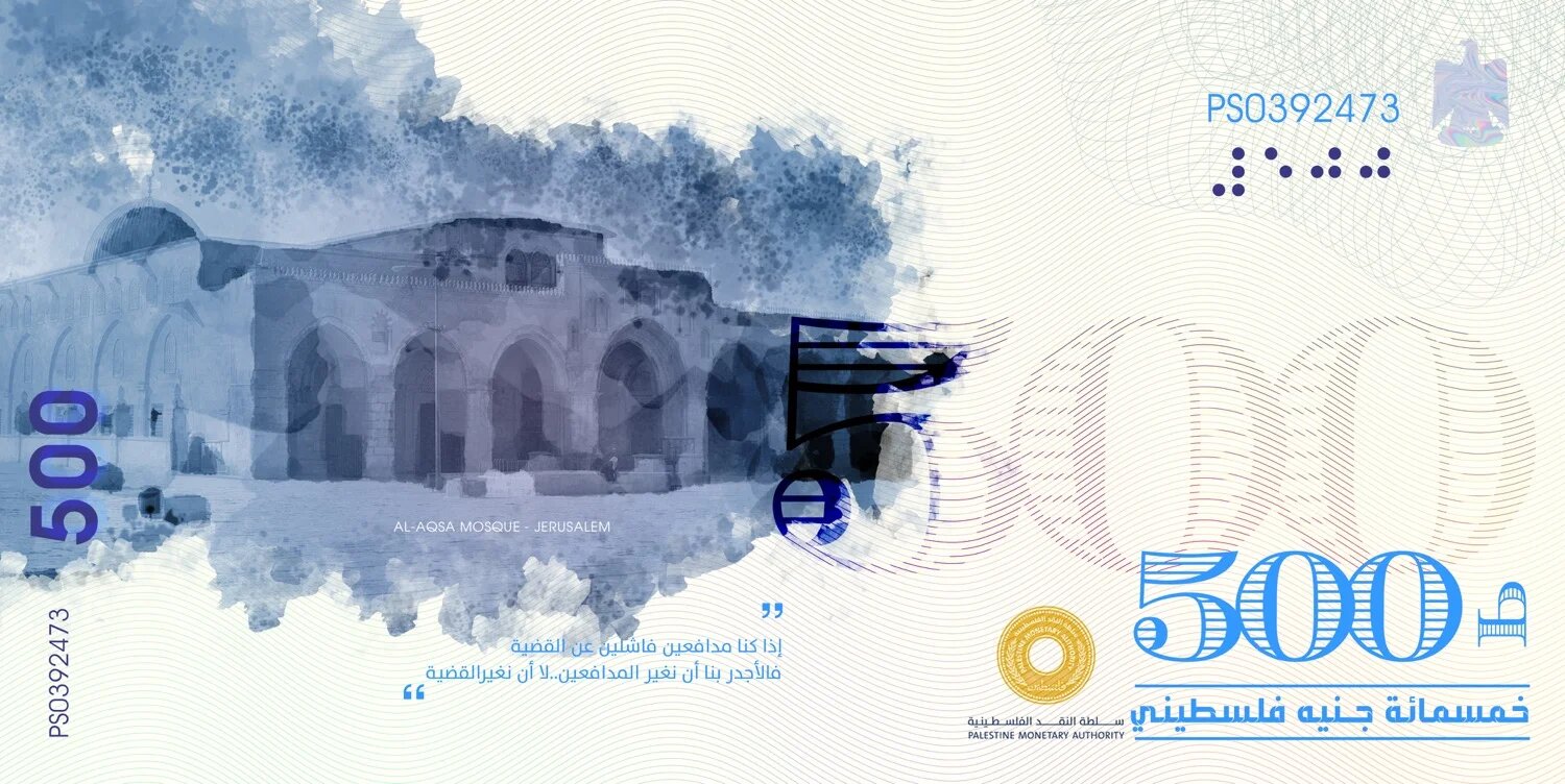 Oda a également souligné que la dépendance vis-à-vis du shekel signifiait que toute l’aide internationale à la Palestine devait être convertie en devise israélienne, renforçant ainsi les réserves de change d’Israël. Ci-dessus, le recto du billet de 500 livres représente la mosquée al-Aqsa à Jérusalem.