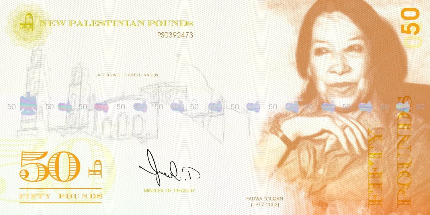 Le verso du billet de 50 livres montre la poétesse et activiste féministe palestinienne Fadwa Touqan, décédée en 2003. À sa gauche figure l’église du puits de Jacob à Naplouse.