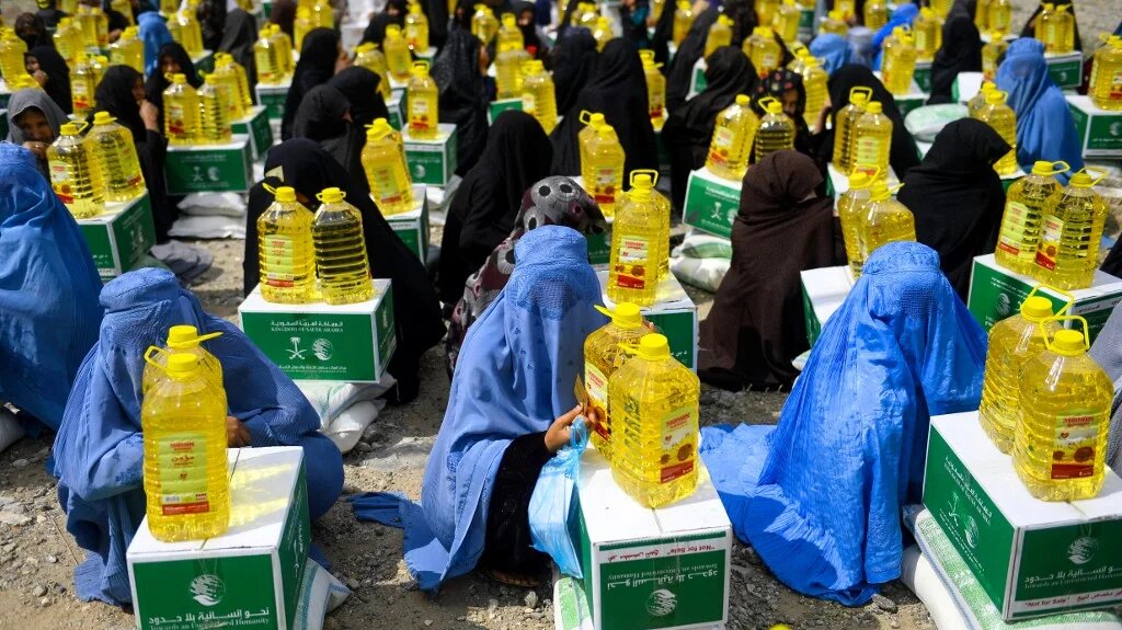 Des Afghanes reçoivent des colis d’aide alimentaire offerts par un organisme de bienfaisance dans la province de Herat, le 23 mai 2019 (AFP)