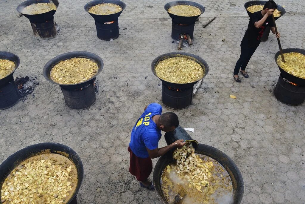 Des hommes préparent des currys traditionnels pour l’iftar devant une mosquée à Banda Aceh, en Indonésie, le 26 mai 2019 (AFP)