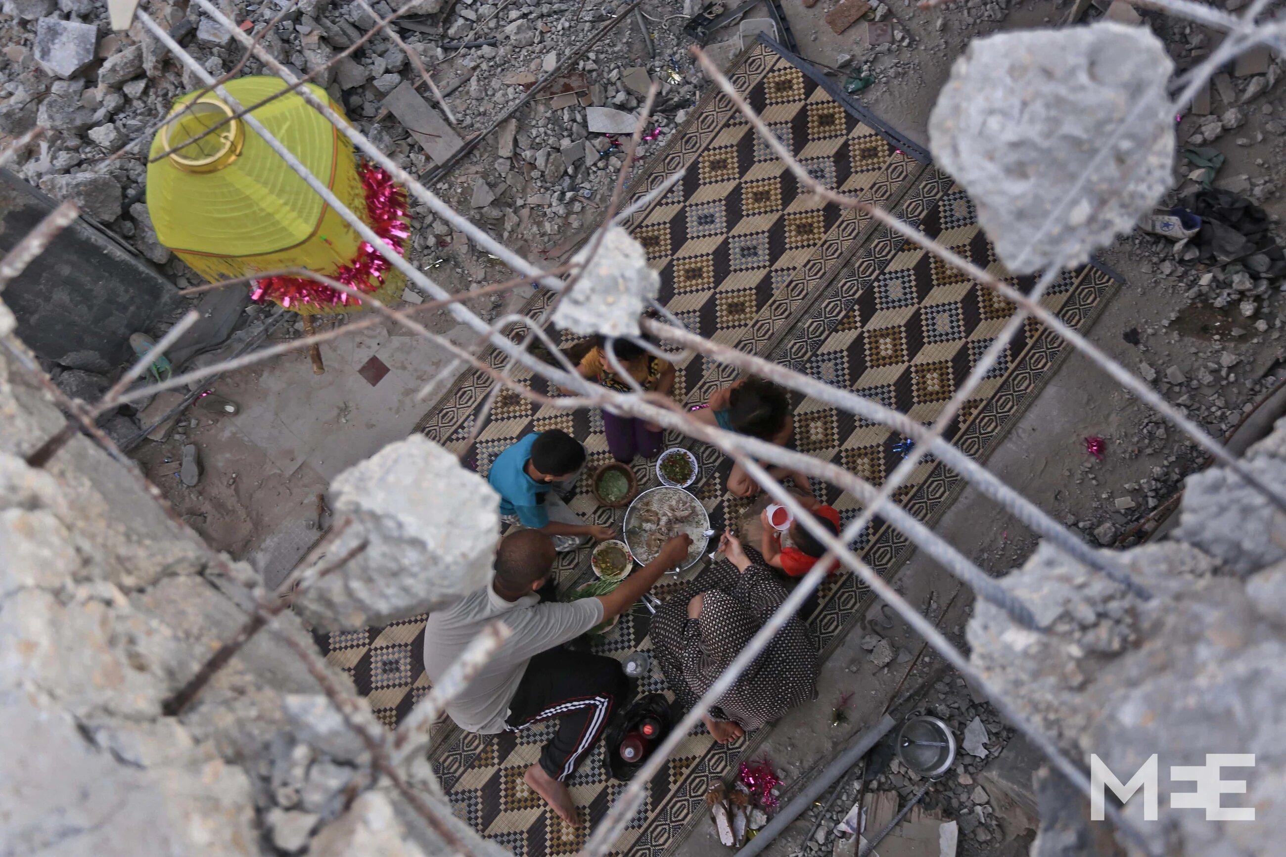 La famille d’Abou Aser réunie autour de l’iftar, le repas qui rompt le jeûne, au milieu des décombres de leur logement détruit (MEE/Mohammed Asad)