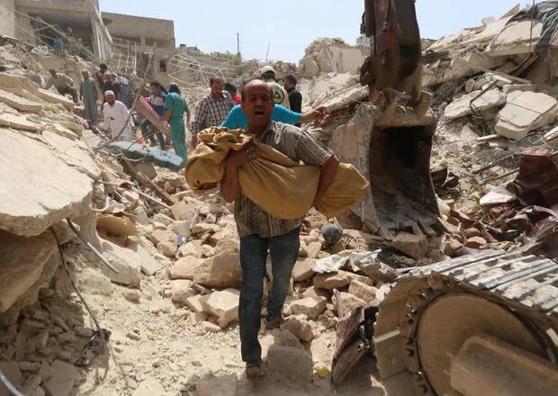 Photo : un Syrien transporte un corps après qu'il a été retiré des décombres des bâtiments ayant été la cible d'un attentat à la bombe perpétré par les forces du gouvernement dans l'arrondissement de Qadi Askar au sud de la ville syrienne d'Alep, le 20 mai 2015 (AFP).