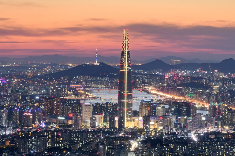 Photo : vue générale de la Lotte Tower et de la tour Namsan Tower. Au centre, la rivière Han au coucher du soleil, Séoul (AFP).