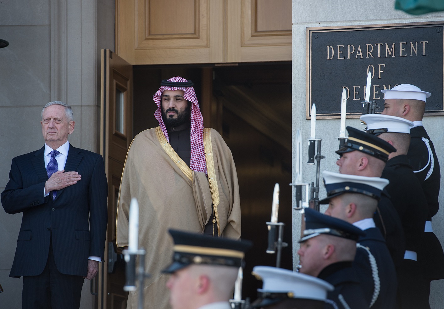 Photo : le secrétaire américain à la Défense, James Mattis, accueille le prince héritier et ministre de la Défense saoudien, Mohammed ben Salmane, au Pentagone, à Washington, le 16 mars 2017 (AFP).